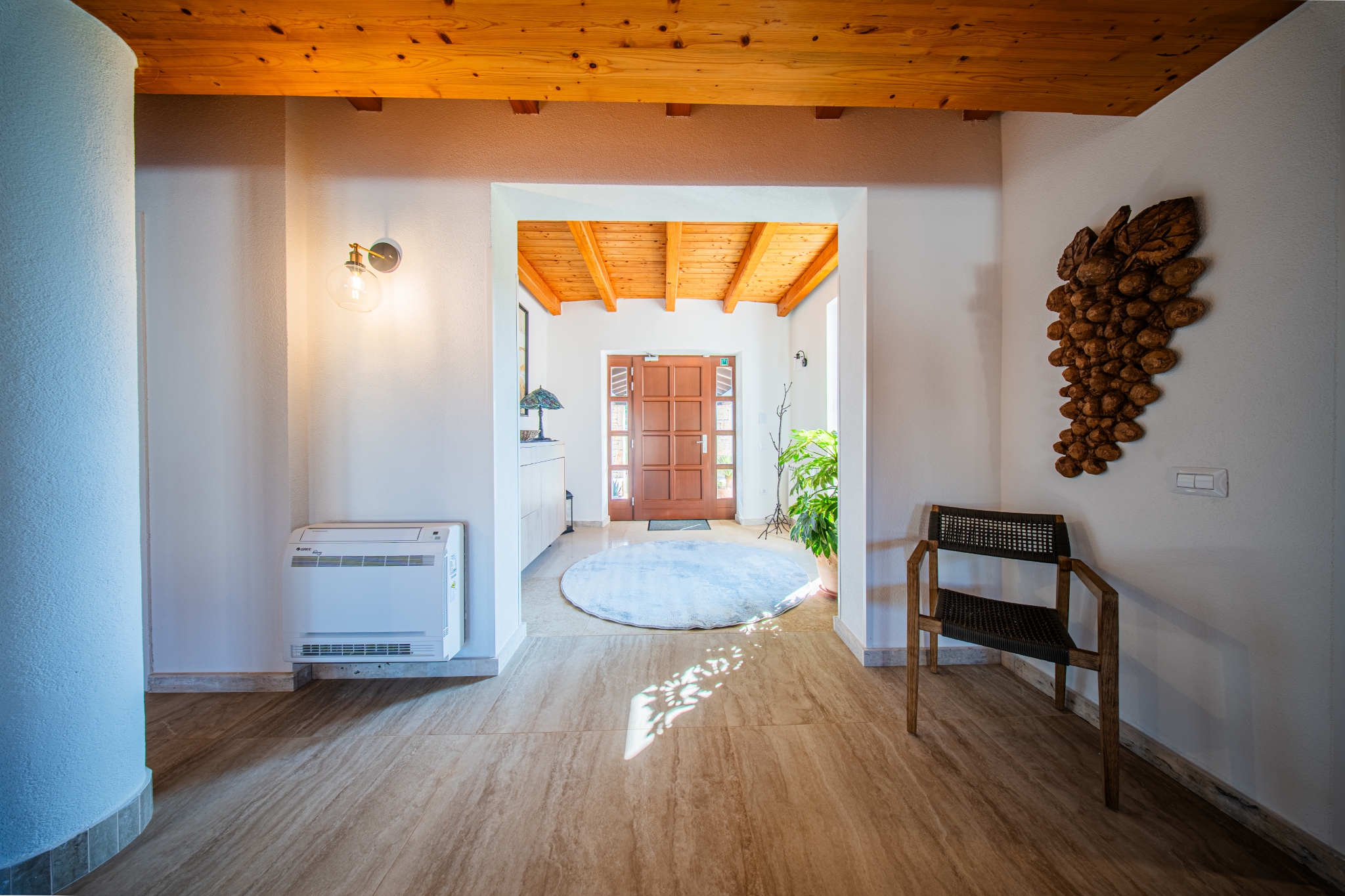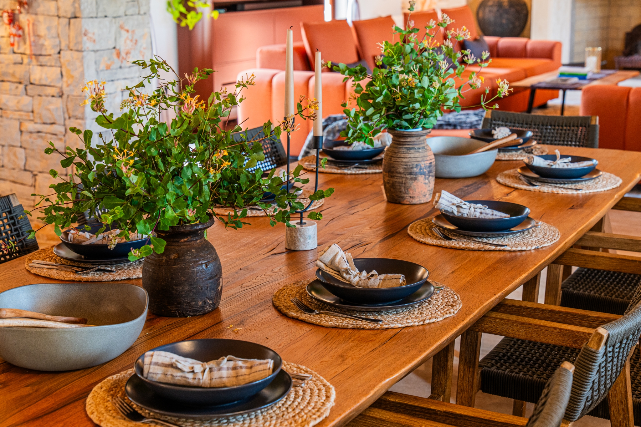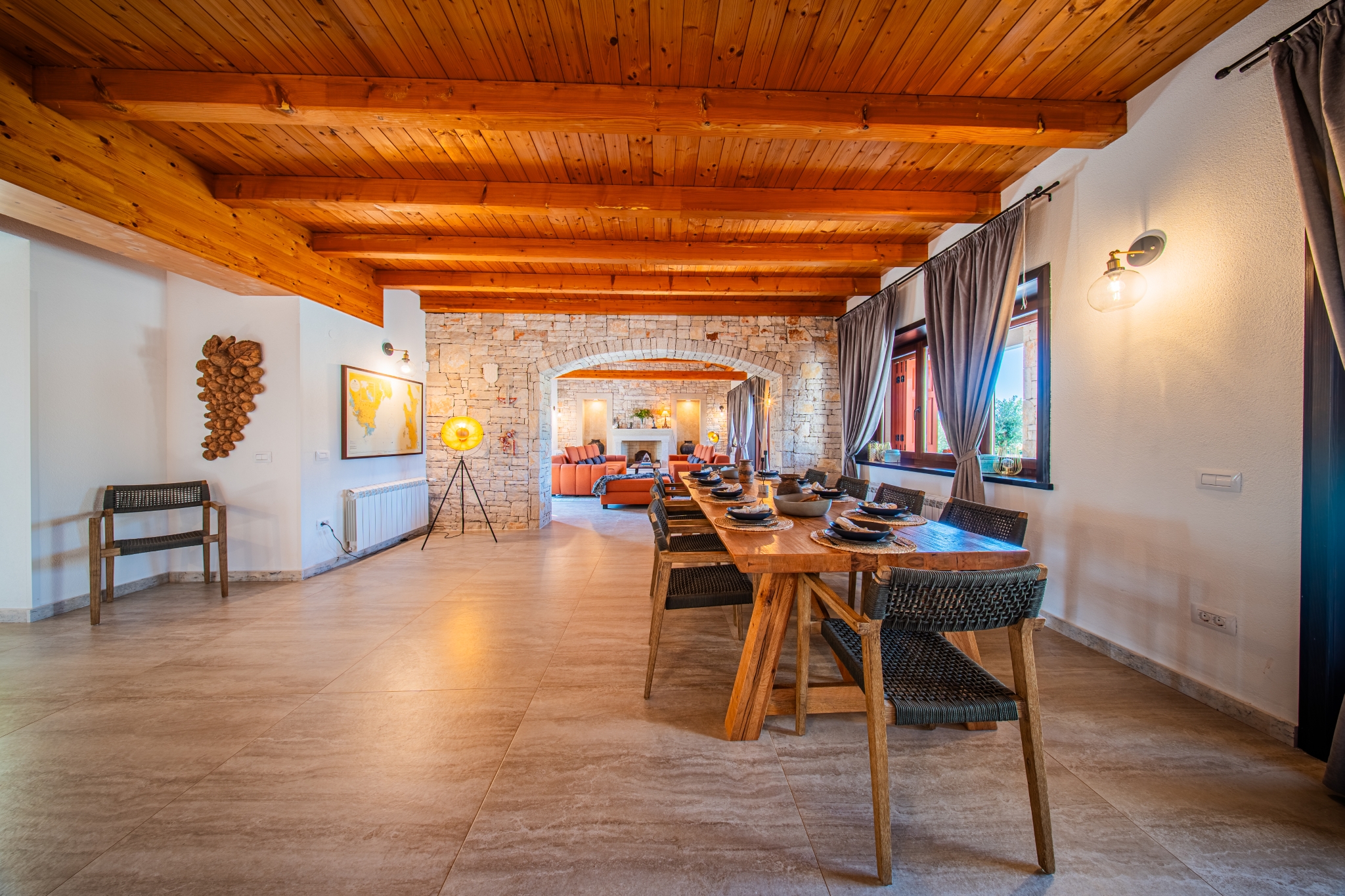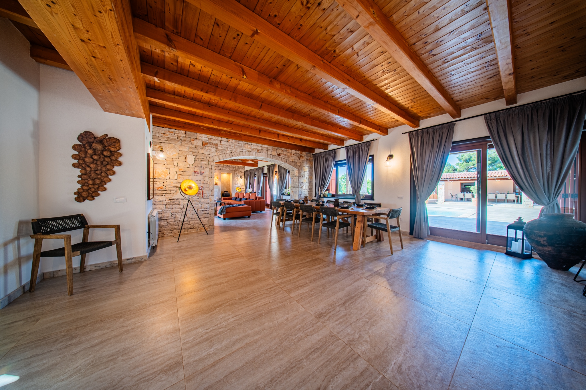Der Innen-Essbereich verfügt über einen großen, luxuriösen Tisch, der für 10 Personen ausgelegt ist. Er befindet sich zwischen der Küche und dem Wohnzimmer und bietet einen bequemen Zugang zur Terrasse und zum Pool. Direkt neben dem Pool befindet sich ein Außen-Essbereich mit Sitzgelegenheiten für 16 Personen, ergänzt durch eine Außenküche und einen Grill.