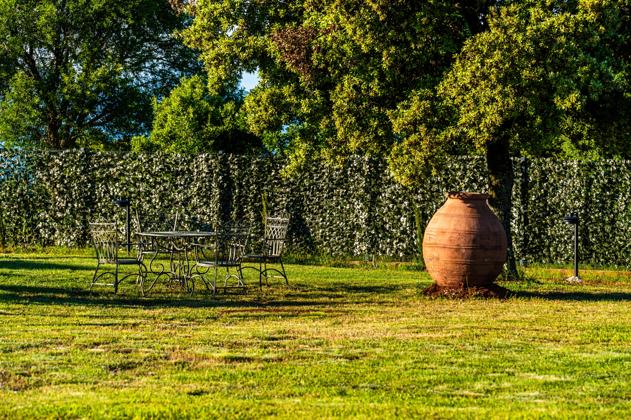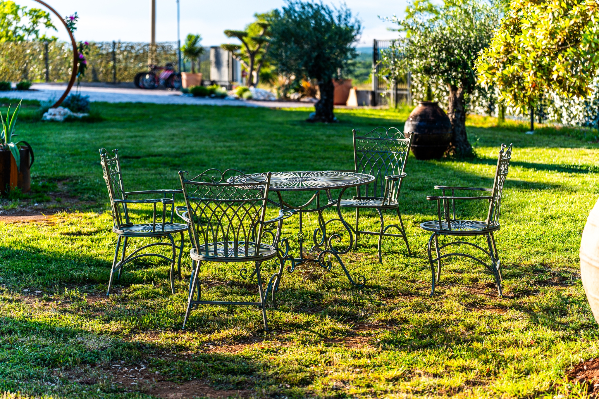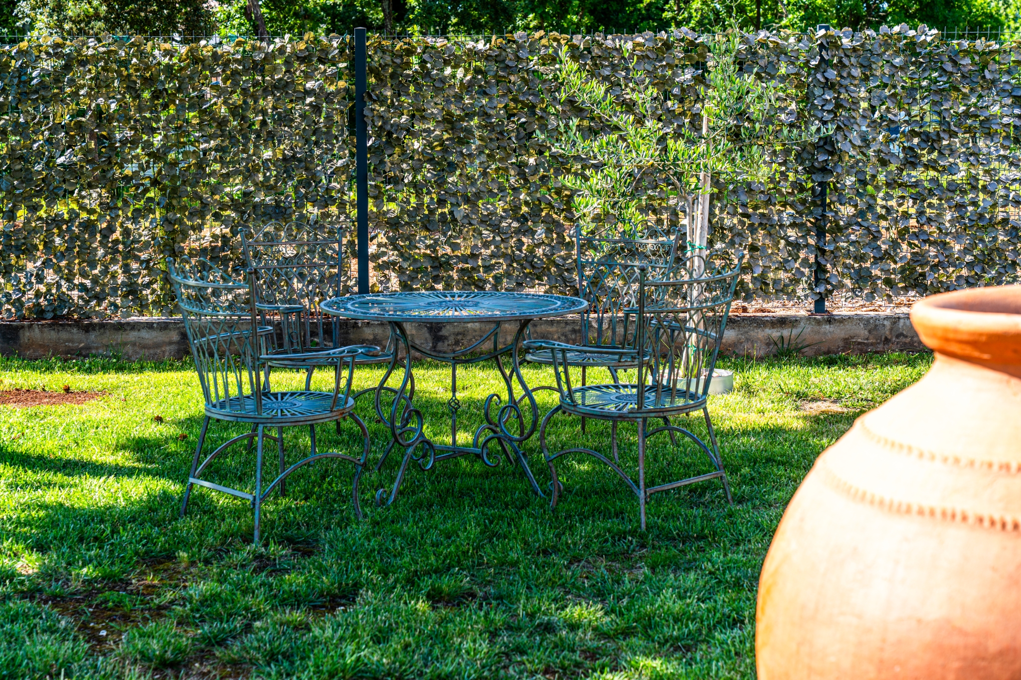 Za potpuni doživljaj ovog mirisnog mediteranskog raja, u vrtu su smještena dva rustikalna seta za sjedenje s drvenim stolovima i stolicama — idealna za opuštanje, čitanje ili jednostavno uživanje u bojama i mirisima Istre i Mediterana.